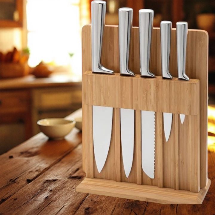 Set complet de 5 cuțite profesionale din oțel inoxidabil, cu suport elegant din bambus natural. Design modern, lame ultra-ascuțite, durabilitate garantată – perfect pentru orice bucătărie.